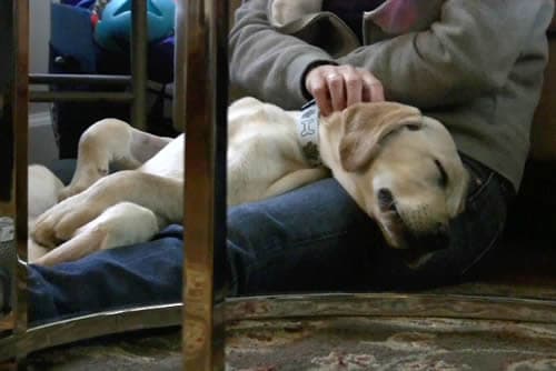 A good exercise to practice with your puppy is cradling. Begin by sitting on the floor with the puppy cradled between your legs. Speak soothingly as you pet your puppy. This a good opportunity to practice felling his toes, looking in his ears and overall acceptance of being restrained. As a working guide dog it is essential that the puppy learn to accept restraint and touching.
