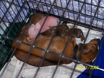 Updated 02/29/2008 – I added an updated article to this blog with more information and pictures of Pink, Tink, and the puppies at Updated Pics and Story: Dachshund Acts As Mom To Baby Piglet.