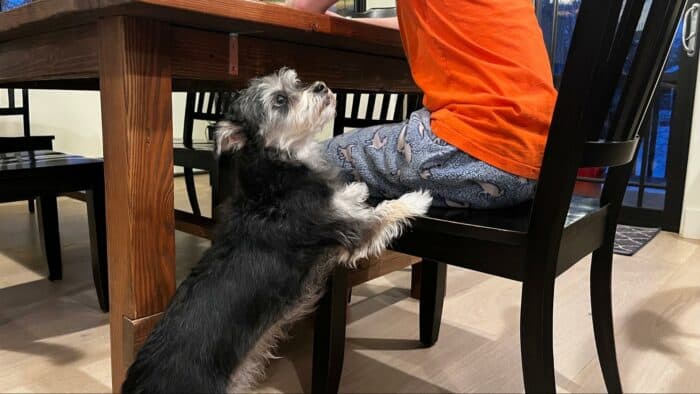 It is also good to make sure when teaching your dog to not “ask” for food, that they are not too hungry themselves.