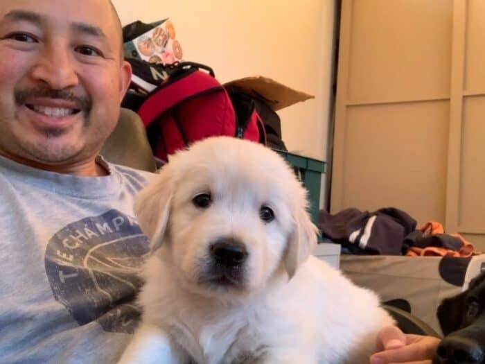 2-month-old female English Cream Golden Retriever, Mochi sitting happily on her bestie’s lap.