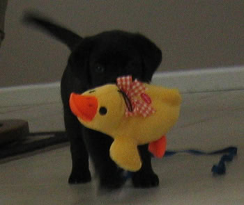 You could also use a blanket instead of a toy or why not use a blanket and a toy? Below is a picture of Stetson with his first toy ducky (I got the scent of the rest of his litter on his toy ducky).