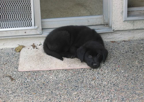 We hurried over to the Carson shelter on a rainy winter day and found a small black male puppy with a tiny white spot on his chest sleeping next to his sister (a black and tan puppy) on the cold floor of the Carson Shelter kennel. I had been looking for puppies for the past month and noticed during my search that puppies were either hopping around full of energy or sleeping in the middle of nap time. We went into the kennel and put the two puppies through a series of puppy temperament tests we learned from the how to choose a puppy section in the Puppies For Dummies book . Both dogs were very lethargic and we thought the male puppy might be a “passive” or “middle man” puppy and the sister might be a “middleman” or “next in line” pup.