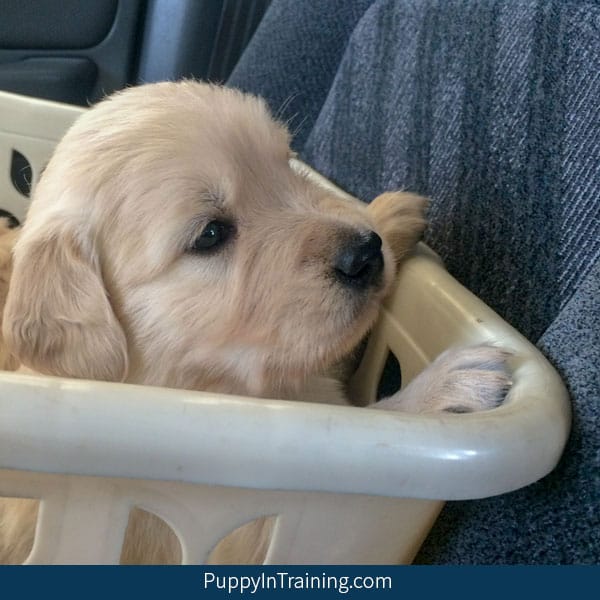 We continue to take our Golden pups out for car rides in the laundry basket.