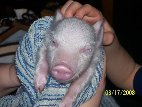 Here’s the latest news straight from their caretaker Mommaj: I just wanted to give you an update on Tink and Pink. Tink weaned Pink from her last week along with the puppies. Pink had a really hard time with it, but the puppies did great. For a few days he was really upset and I couldn’t get him to hardly eat. Then he started eating his formula really well. He also is eating the puppy food, but not very much pig food. He started nibbling on the puppy food a few weeks ago when the puppies started.